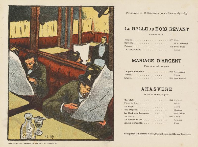 Theatre programme for La belle au bois rêvant by Fernand Mazade, Mariage d'argent by Eugène Bourgeois and Ahasvère by Herman Heyermans (Théâtre Libre, 12 June 1893)