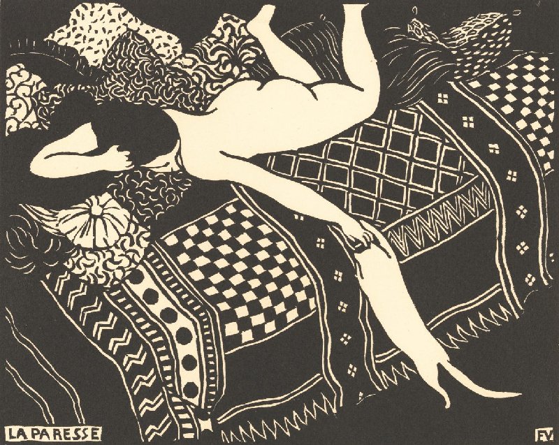 Laziness is one of Vallotton’s most famous prints. His wooden block combines line, surface and contrast to create an elegant and seductive image. The nude woman and the cat consist primarily of areas of white. The sofa on which she stretches languidly is made up, by contrast, of intricate patterns. Together they form a decorative whole.